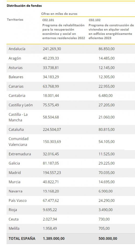 De los 1.889 millones de euros, 1.389 millones de euros podrán traspasarse este año 2022 a las comunidades y ciudades autónomas para financiar la rehabilitación y regeneración de viviendas, barrios y edificios residenciales, mientras que los 500 millones de euros restantes se traspasarán a partir del año 2023 para levantar viviendas en alquiler social. Así, se busca reducir un 30% el consumo de energía primaria no renovable de los hogares y mejorar el confort y la habitabilidad, promoviendo, por ejemplo, el cambio de ventanas, el despliegue de sistemas de calefacción alimentados con energías renovables, o la renovación de sistemas de calefacción y de refrigeración obsoletos.